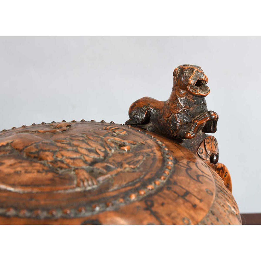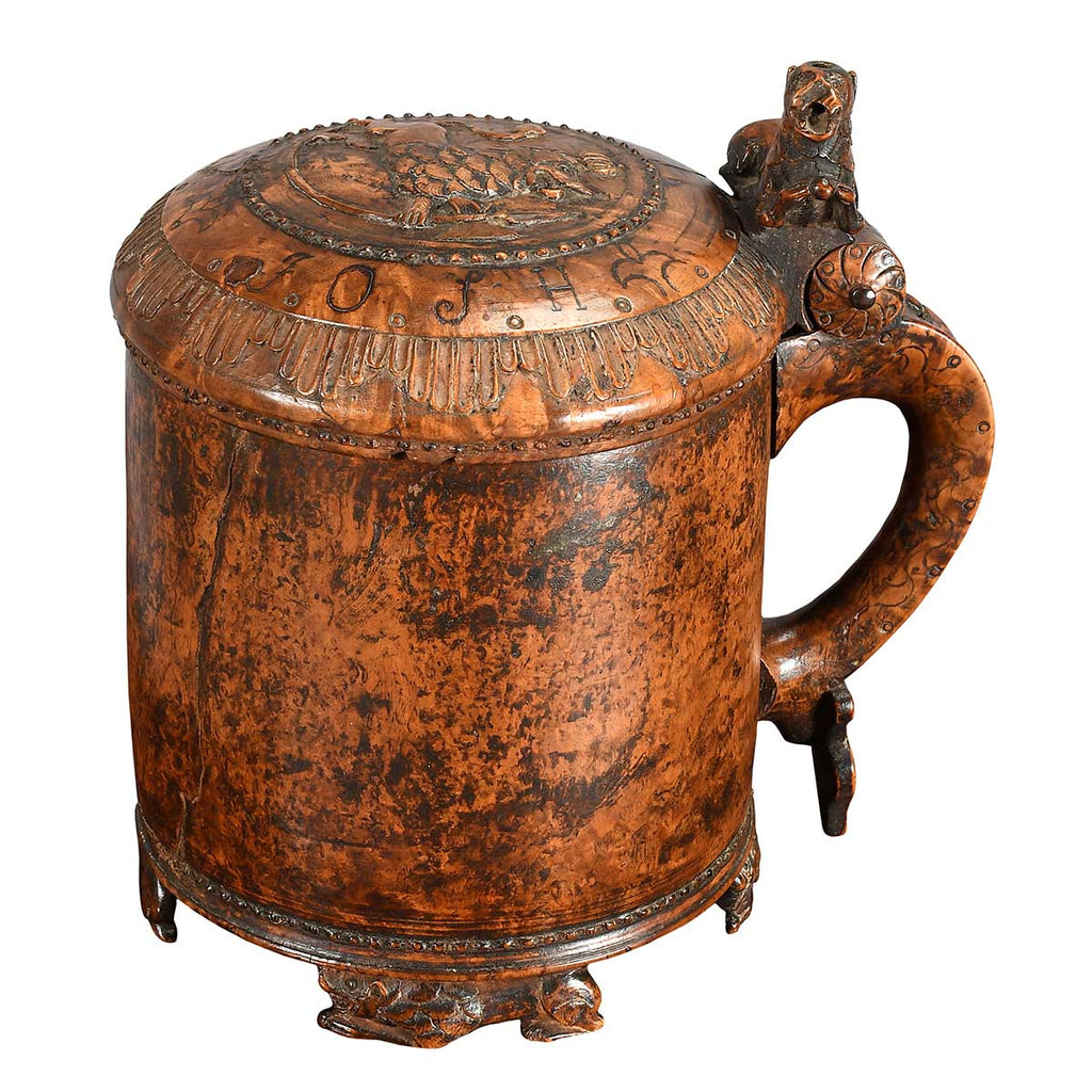 An unusually large birch wood tankard, the lid carved with a crowned lion holding a spear and inscribed with the year 1810. The handle is also topped with a carved lion. Terrific patina and great burr figuring to the grain. A section of the side has come out due to age splits and been glued back in place. Small losses to the lion at the top of the handle.