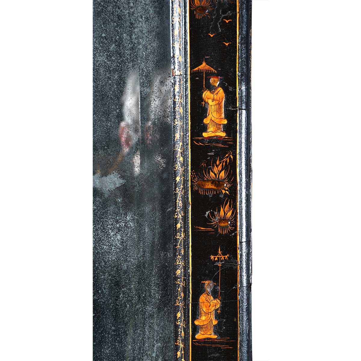 A Queen Anne period mirror with finely decorated black and gold chinoiserie frame. Consisting of two beveled mirror plates. The top, smaller plate of arched shape. The lower mirror plate possibly replaced.
