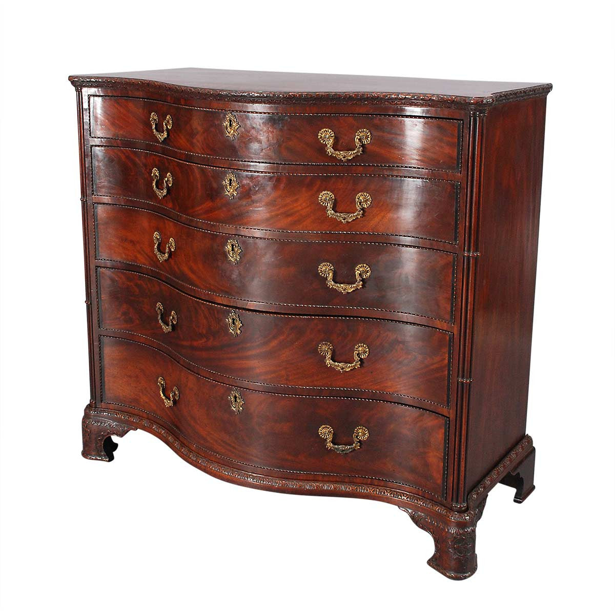 An unusually large serpentine chest of drawers. Each of the five graduated drawers are outlined with a carved "braided" beading and mounted with the original ormolu handles. The edge of the top is carved with a ribbon-and-rose motif and the front corners of the case are carved with tri-cluster columns. Standing on bracket feet which are also well carved with a cabochon. The figured timber is of exceptional quality. A very similar example is found in the drawings of Mayhew and Ince.
