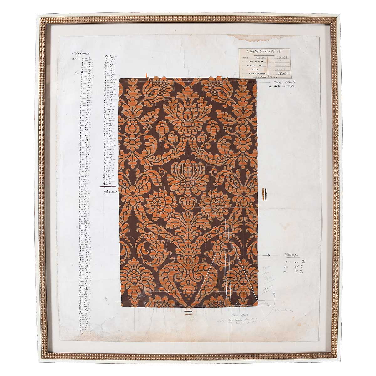 Hand-painted ‘mise-en-cartes’ or point papers. These were the templates used to create woven textiles. Pencil drawn grid lines represent the warp and weft. The margins contain hand written instructions for the weaver pertaining to color, preparation of the loom, etc. Most bear labels indicating the pattern name and cataloguing information from F. Vanoutryve & Cie, a major textile manufacturer originally based in Mouscron, Belgium. Other examples of point papers can be found in The Metropolitan Museum of Art, The Art Institute of Chicago, and The Philadelphia Museum of Art among others. Priced and sold individually. Frame sizes range from 44" x 33" to 26" x 21".