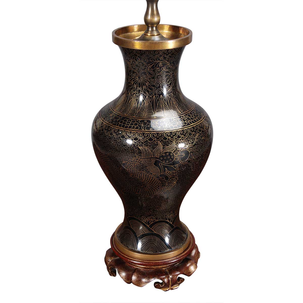 A pair of mirror black baluster-shaped vases now drilled and wired as lamps. With overall gold foliate decoration and also depiciting a dragon.