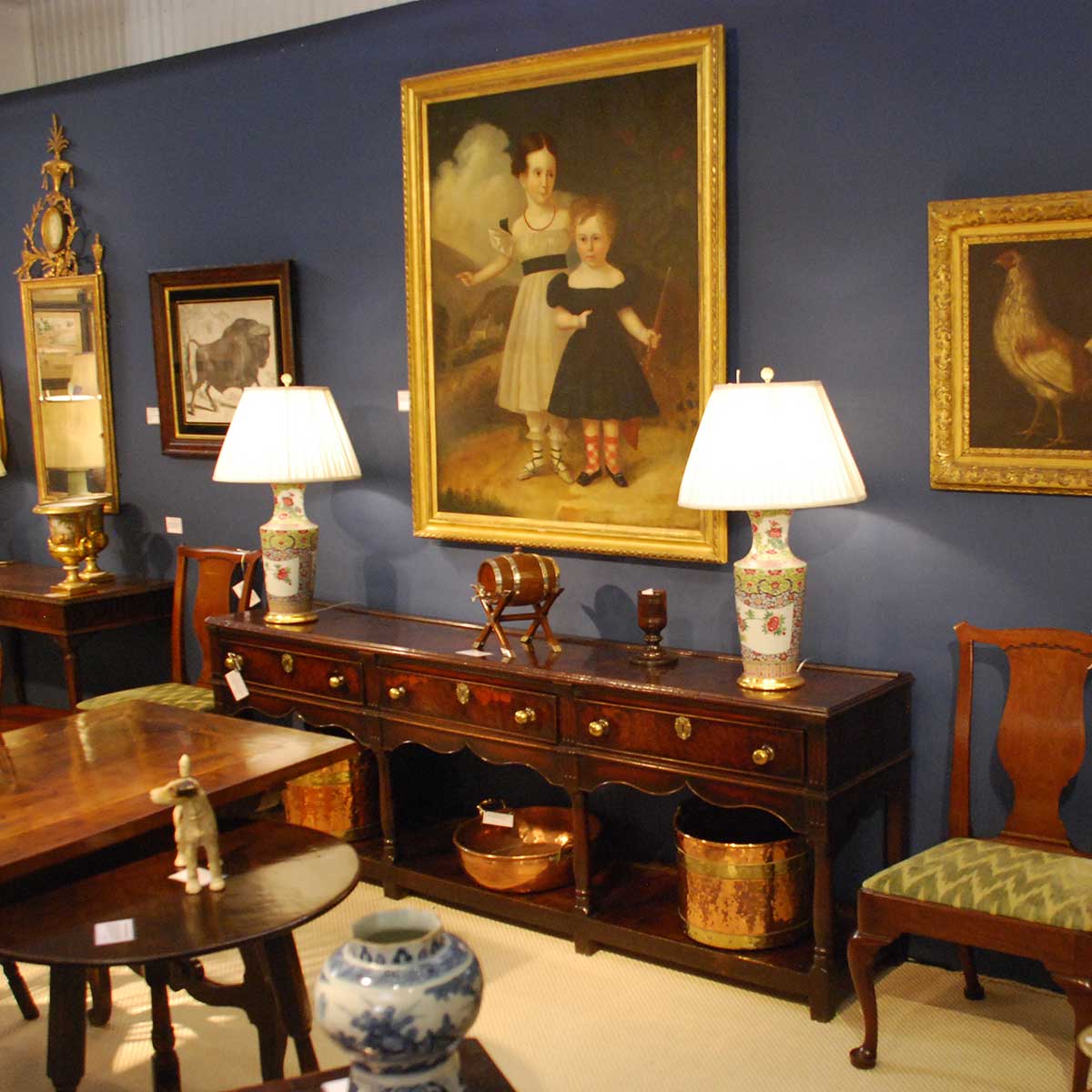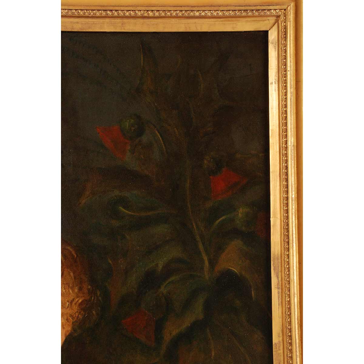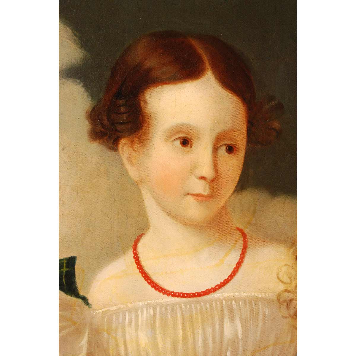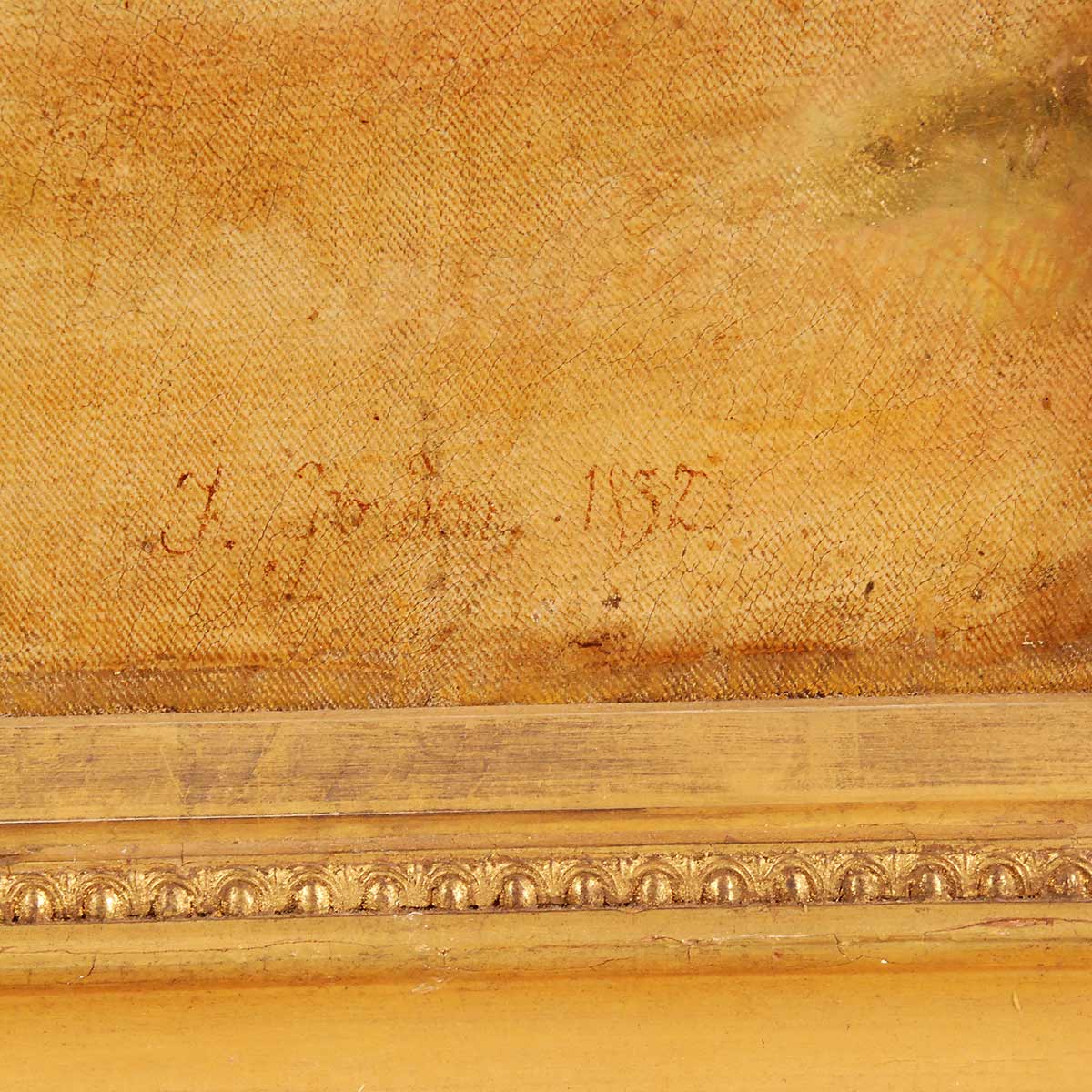 A portrait of two children, one holding a rifle, in a pastoral landscape. Signed and dated in the lower right "F. Gordon 1832." The thistle climbing up the right side of the frame might suggest an origin of Scotland or possibly Northern England. Oil on canvas in a later, gilded frame. Glue re-lined.
