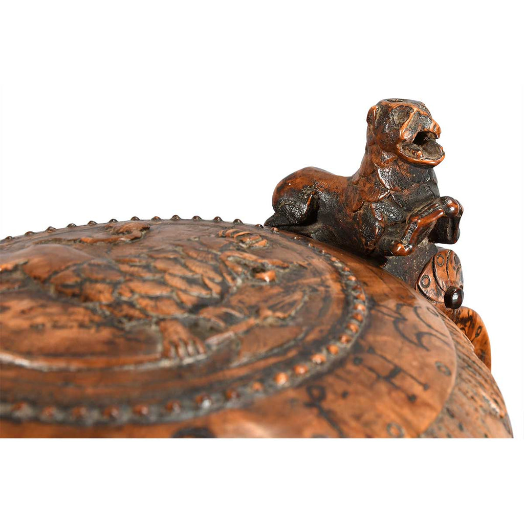 An unusually large birch wood tankard, the lid carved with a crowned lion holding a spear and inscribed with the year 1810. The handle is also topped with a carved lion. Terrific patina and great burr figuring to the grain. A section of the side has come out due to age splits and been glued back in place. Small losses to the lion at the top of the handle.