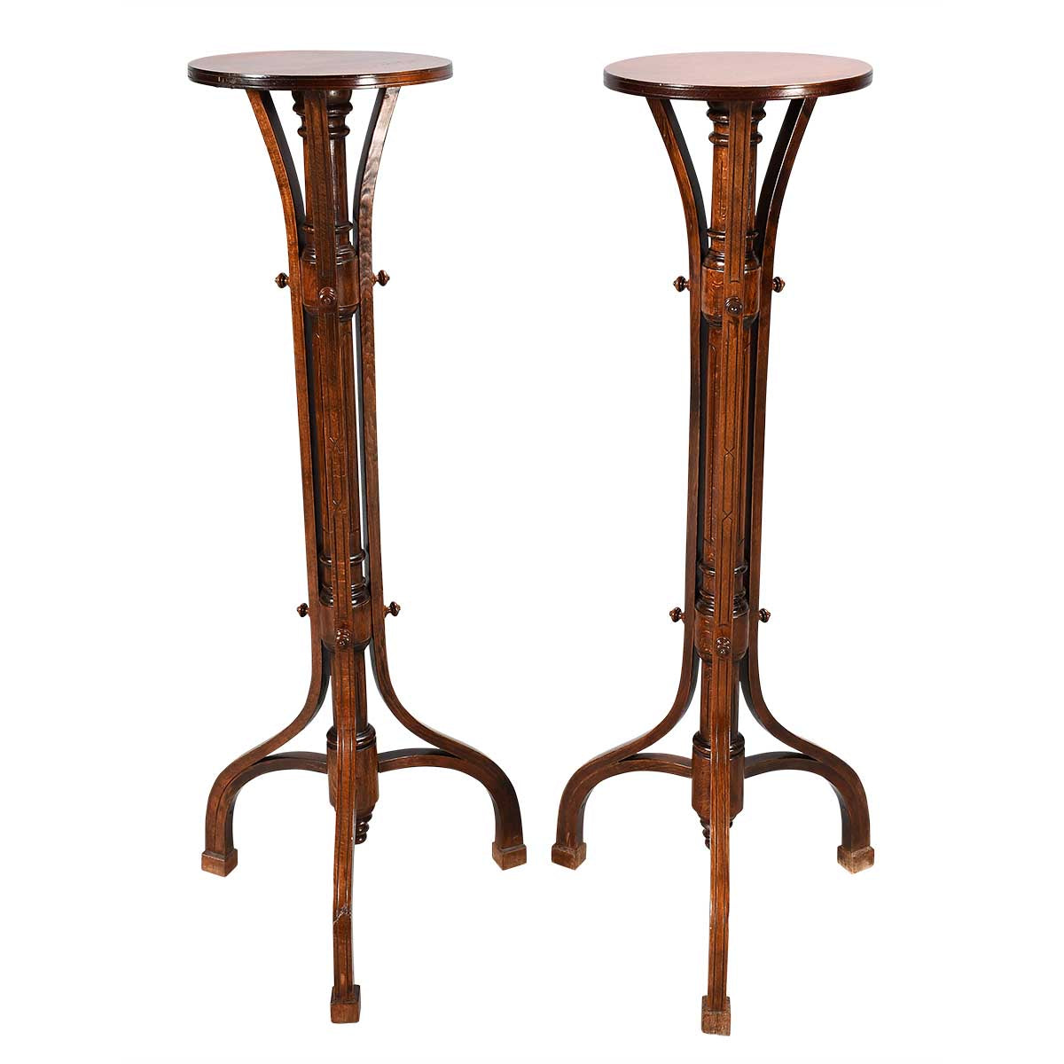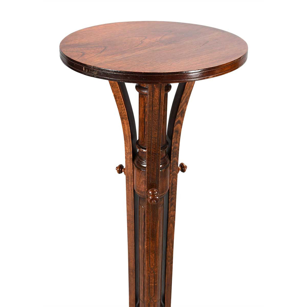 A pair of Aesthetic Movement torcheres in oak. The circular tops are supported by a turned column raised on bentwood legs ending in block feet. Probably Austrian.