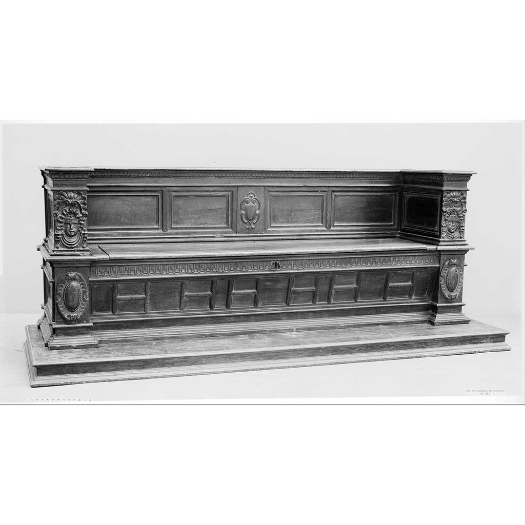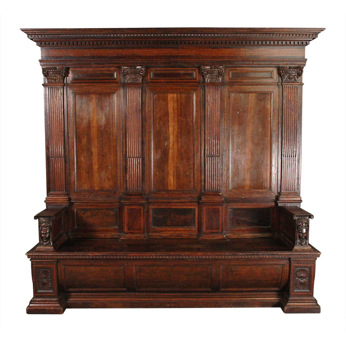 A rare walnut lettuccio (a large, high-back bench or daybed) with paneled back, geometric inlay, and carved masks on the arm supports. The panels of the back are flanked by stop-fluted pilasters with carved Corinthian capitals. The hinged seat lifts to reveal storage below. The photos below include examples from the collection of Julian Di Medici, Davanzati Palace (Florence), and a cassapanca from the Met with similar mask carving on the arm supports. Provenance: James Brett Antiques, Norwich, England; Private Cincinnati collection.