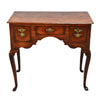 An English corner chair with pierced backsplats, a drop-in seat, shaped arms, and straight, molded legs connected by stretchers.