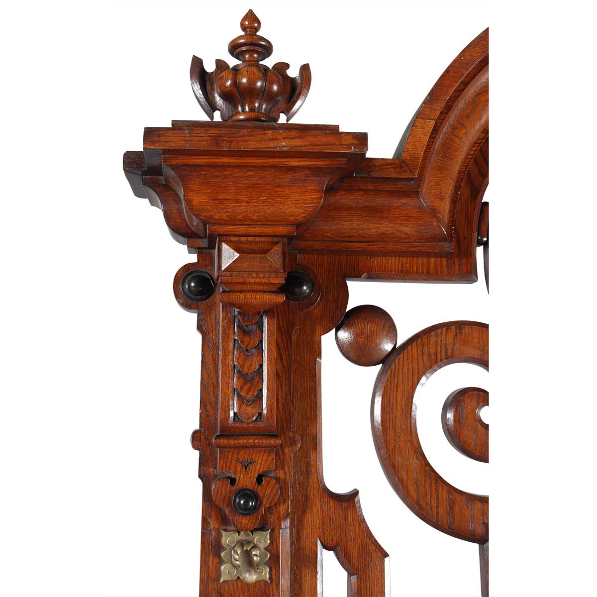 A very large oak hall tree with arched top flanked by turned finials. Mounted with twisted brass posts for hanging hats and coats. A twisted brass rail runs between two boldly turned balusters to hold umbrellas and canes.
